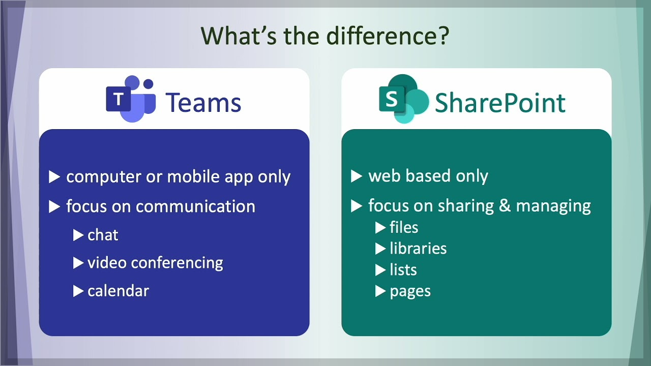 ▶ Microsoft Teams: Teams 내에서 공유된 파일은 SharePoint에 저장됩니다. 즉, Teams는 SharePoint를 백엔드로 사용하여 파일을 관리합니다. 사용자는 채팅이나 팀 채널 내에서 파일을 공유하고 협업할 수 있지만, 파일의 저장소는 SharePoint입니다. Teams는 파일을 실시간으로 공유하고 간단하게 관리하는 데 중점을 두고 있습니다.